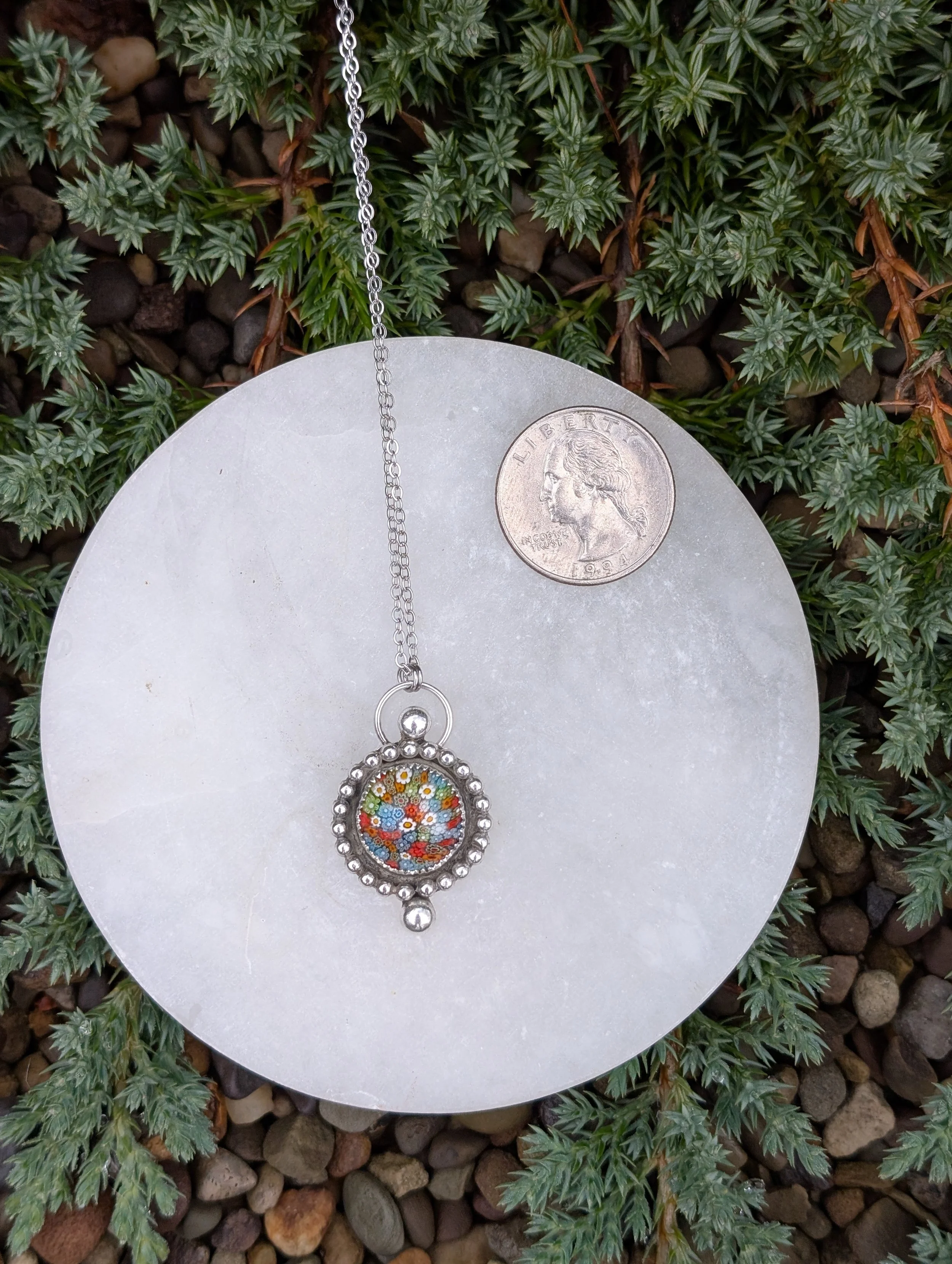 Blue Stained Glass Bubble Necklace! This is set is a handmade sterling silver bezel. This is placed on an 18 inch stainless steel chain. If you would like a longer or shorter chain, please just send me an email and I will gladly make it your desired length!